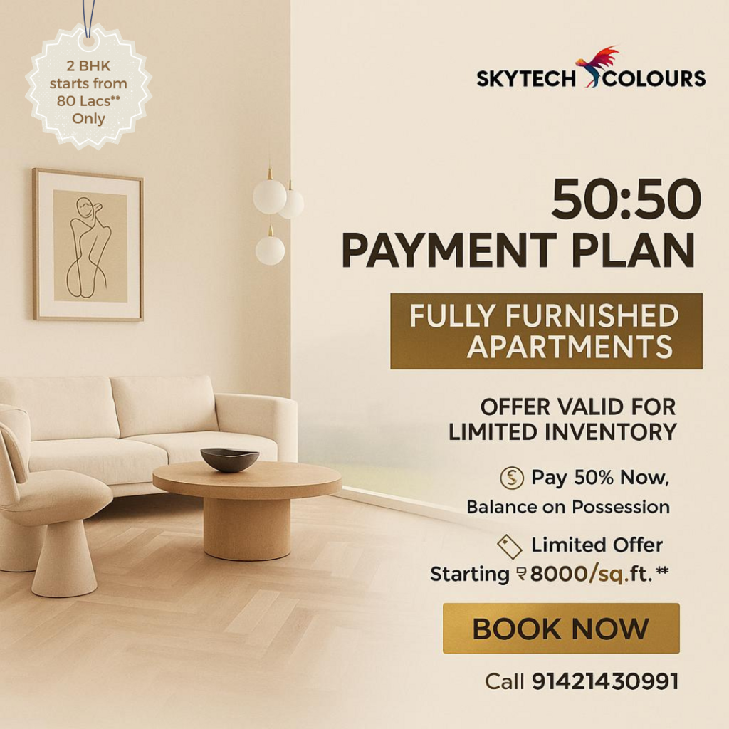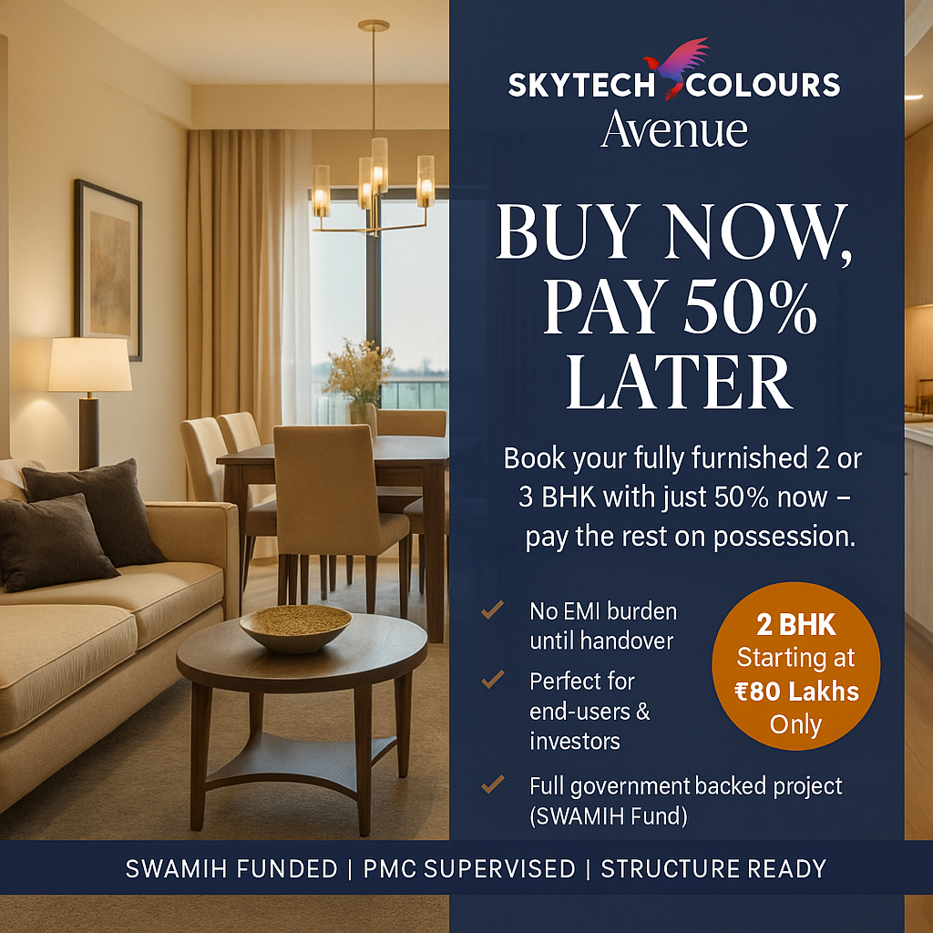 Every home at Skytech Colours Avenue comes with complete furnishing β including ACs, beds, wardrobes, sofa, dining set, and modular kitchen β so you can move in stress-free. The project offers the convenience of a 50:50 payment plan, letting you book your dream home with just 50% now and the balance on possession.